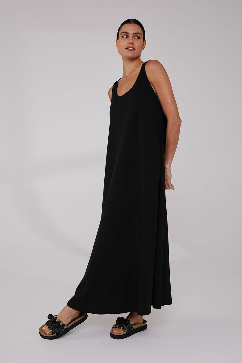 Vestido confeccionado em malha flamê 100% algodão. O fio flamê utilizado dá à malha uma textura leve e diferenciada, trazendo um toque moderno e urbano, além da maciez e conforto proporcionados pela fibra natural de algodão. Modelo regata nadador, evasê longo, com decote U.