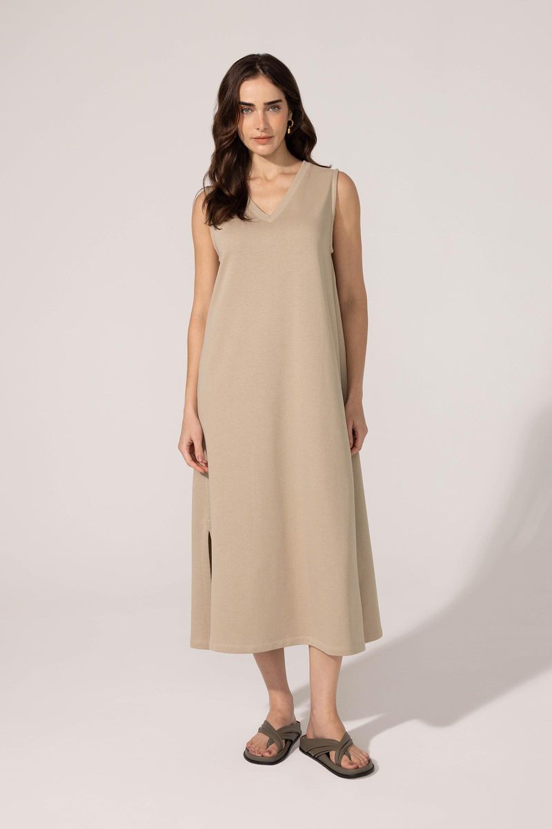 Vestido confeccionado em moletom 100% algodão. Toque macio e agradável, oferecendo muito conforto. Modelo regata, com comprimento midi. Decote V e aberturas laterais. Decote e cavas em ribana.