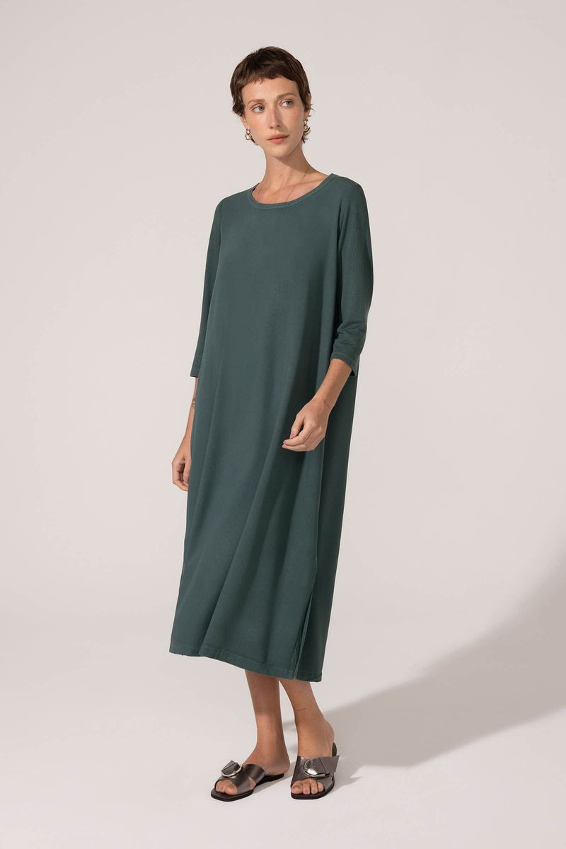 Vestido confeccionado em tecido plano de viscose com linho e malha de viscose, linho e elastano. Frente e parte inferior das costas em tecido plano. Mangas e parte superior das costas em malha. Fluído, leve, fresco e confortável, além de ótimo caimento. Modelo evasê, com comprimento midi. Decote U, mangas 3/4 e palas nas costas. Aberturas laterais. Peça com tingimento manual.