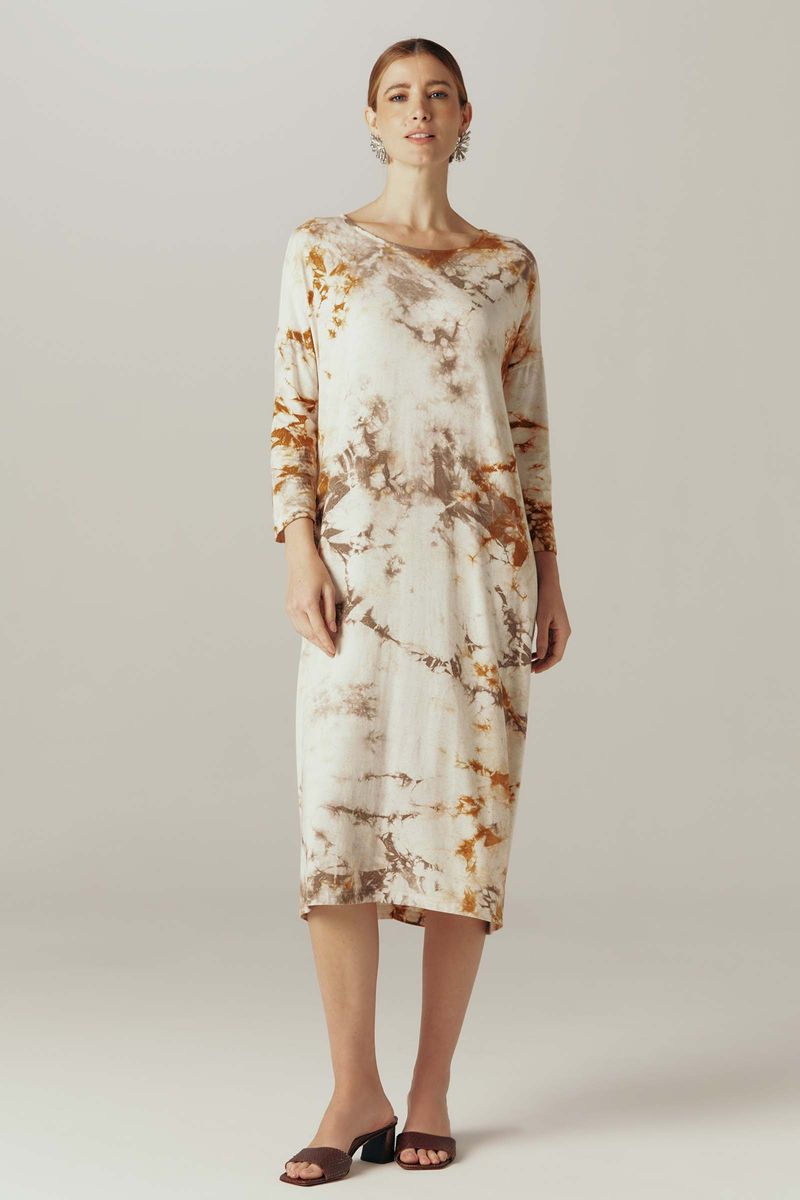 Vestido confeccionado em malha de viscose com linho e elastano. Possui o toque macio e agradável da viscose, além da durabilidade e conforto da fibra de linho. Modelo solto ao corpo, com comprimento midi. Decote redondo, mangas 3/4. Cavas deslocadas. Peça com tingimento manual.