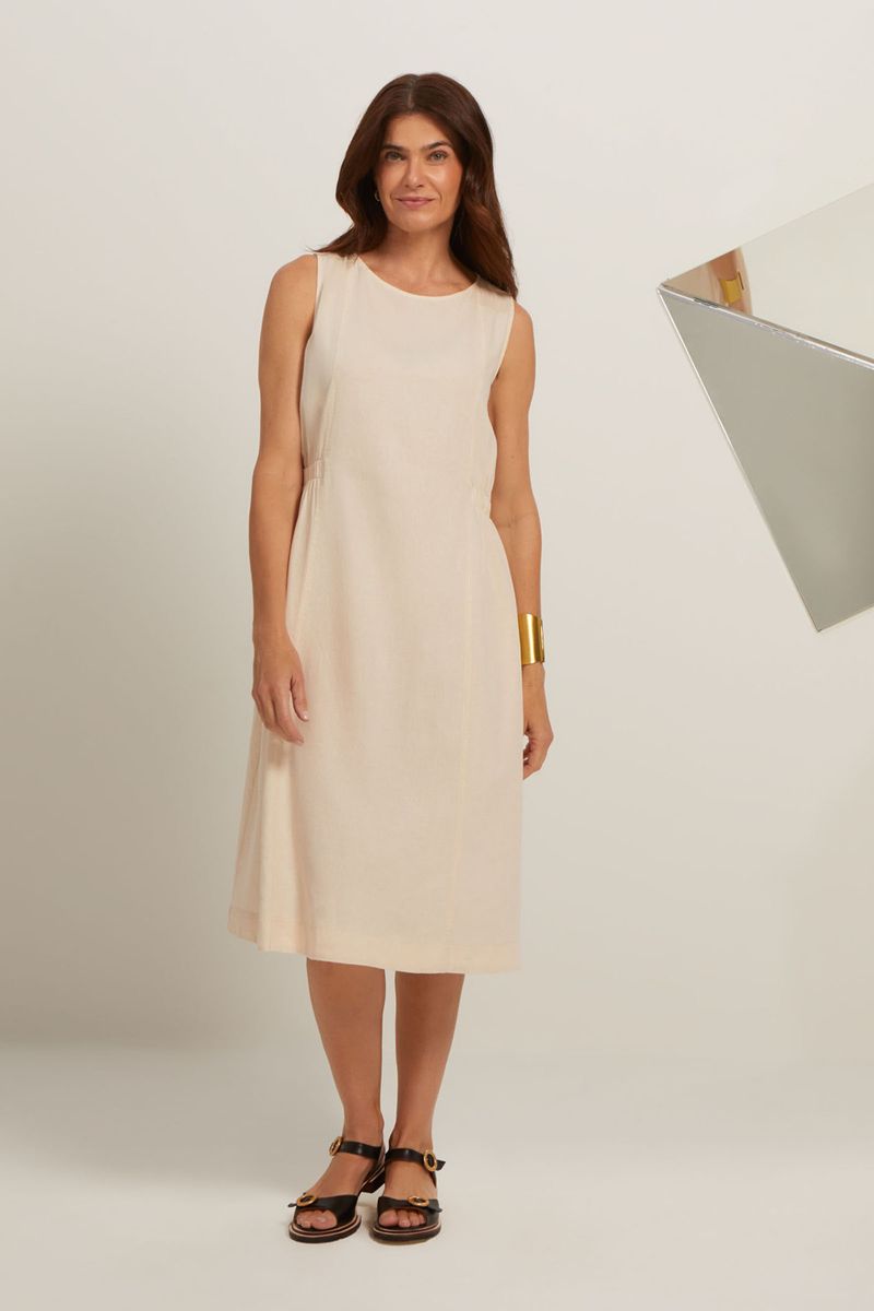 Vestido confeccionado em tecido plano. Com toque agradável e ótimo caimento. Ar rústico e fresco, muito característico da fibra natural. Modelo regata com comprimento midi. Decote redondo e recortes frontais. Gota nas costas com fechamento em botão madrepérola. Recorte na cintura, com aplicação de elástico nas laterais.