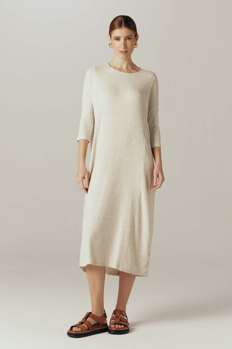 Vestido confeccionado em malha canelada, produzida com a fibra Modal da Lenzing Fibers, empresa responsável pela produção desta fibra sustentável. Combina altíssima maciez, leveza, ótimo caimento e fluidez. Além disso, permite que o corpo respire, pois possui uma excelente absorção e evaporação de umidade. Com toque suave e bastante elasticidade. A combinação das fibras naturais de linho e modal, dão um aspecto natural e rústico. Modelo com comprimento midi. Decote redondo, cavas deslocadas e mangas 3/4. Recortes laterais. Meio frente e meio costas da peça com canelado no sentido vertical, e recortes laterais no sentido horizontal.
