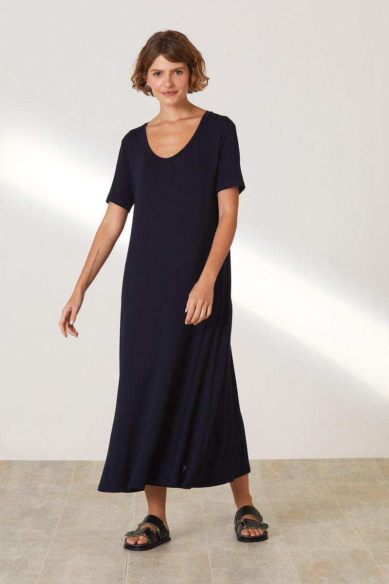 Vestido confeccionado em viscose de Bambu, DNA da Yogini. Roupa que respira, abraça, acolhe, refresca e aquece. Apresenta toque suave e delicado, respeitando a forma do seu corpo e unindo conforto com caimento. Modelo evasê, com comprimento midi, decote U e mangas curtas.