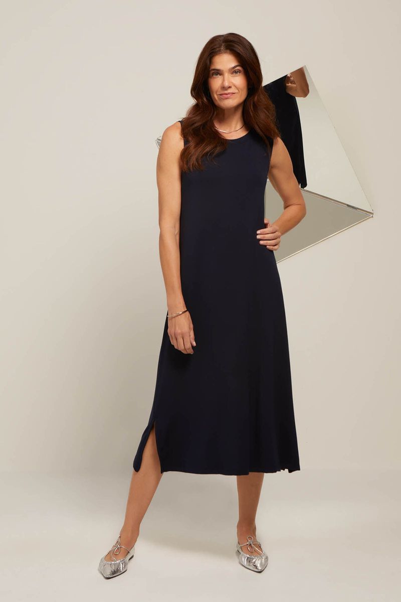 Vestido confeccionado em viscose de Bambu, DNA da Yogini. Roupa que respira, abraça, acolhe, refresca e aquece. Apresenta toque suave e delicado, respeitando a forma do seu corpo e unindo conforto com caimento. Modelo regata, evasê. Decote redondo e aberturas laterais.