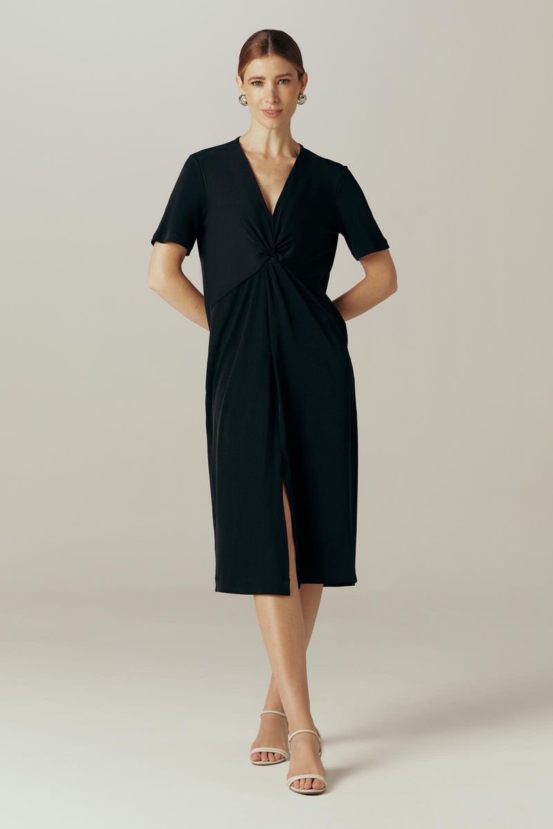 Vestido confeccionado em malha com textura creponada. Toque agradável e ótimo caimento. Modelo com comprimento midi. Frente dupla, com detalhe frontal em nó. Saia com recorte no meio frente e fenda frontal. Barra larga.